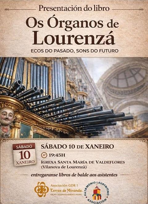 A asociación Patrimonio Laurentino explica que os autores desta publicación, titulada Os órganos de Lourenzá. Ecos do pasado, sons do futuro, son os especialistas nesta temática Belén Bermejo López e Andrés Díaz Pazos e salienta que os órganos da Igrexa de Lourenzá “destacan tanto polas súas características como pola conservación de compoñentes orixinais. Este sábado 10 terá lugar unha presentación en Lourenzá dun libro na que poderemos coñecer moitos máis datos destes exemplares únicos”.