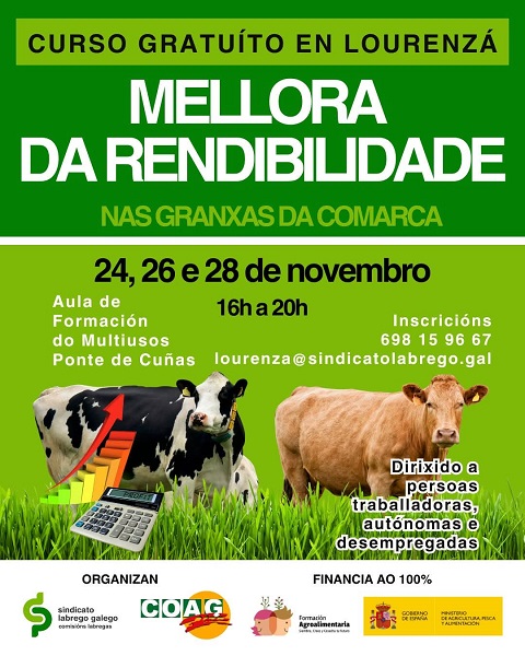 O Sindicato Labrego Galego (SLG) ofrece un curso de mellora da rendibilidade nas granxas da comarca en Lourenzá os días 24, 26 e 28 de novembro. Será na Aula de Formación do Multiusos Ponte de Cuñas de 16 a 20 horas.