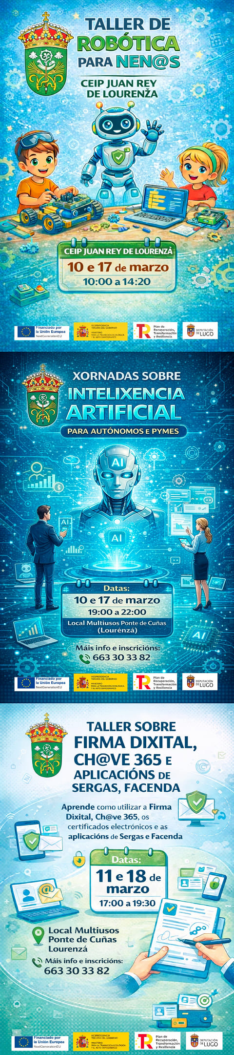 Un dos cursos é de robótica e terá lugar no Ceip Juan Rey para todo o alumnado, os días 10 e 17 de marzo. Os outros dous desenvolveranse no Multiusos Ponte de Cuñas: un deles, sobre intelixencia artificial e destinado a autónomos e pemes, será os días 10 e 17 de marzo de 19:00 a 22:00 horas; e o outro, dirixido a toda veciñanza en xeral e que tratará sobre a Chave 365, o certificado dixital, etcétera, levarase a cabo os días 11 e 18 de marzo de 17:00 a 19:30 horas.
