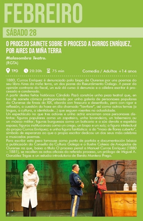 A sinopse é a seguinte: “1880, Curros Enríquez é denunciado polo bispo de Ourense por uns poemas do seu libro Aires da miña terra, un dos piares do Rexurdimento Galego. A pesar da opinión contraria do fiscal, un xuíz dá curso á denuncia e o célebre escritor é procesado e condenado. A partir destes feitos históricos Cándido Pazó constrúe unha peza teatral que, en ton de sainete cómico protagonizado por unha galería de personaxes populares do Ourense de finais do XIX, aborda con frescura e desenfado, pero con rigor e reflexión, a cuestión do hoxe en día chamado lawfare, así como outros temas (a lingua, a cultura, a identidade...) que seguen vixentes na actualidade. Un espectáculo no que tres actores e unha actriz encarnan once personaxes distintos: figuras populares coma un zapateiro, unha lavandeira, un taberneiro ou un músico militar; figuras burguesas coma un boticario e a súa devota e espelida esposa; figuras institucionais coma un crego, un bispo e un xuíz; a figura intelectual do propio Curros Enríquez; e unha figura fantástica: a do maio de flores cuberto, símbolo de esperanza ao que o propio escritor dedicou un dos seus máis celebres e musicados poemas. Para escribir esta peza tomouse como punto de partida e documentación básica a publicación do Consello da Cultura Galega e o Ilustre Colexio de Avogados de Ourense na que, baixo o título O proceso penal a Manuel Curros Enríquez (1880 – 1881), se recollen as actas oficiais do referido proceso, un prólogo de Miguel A. González Trigas e un estudio introdutorio de Benito Montero Prego”, explica o Concello de Viveiro.