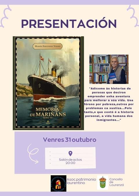 O xornalista e escritor Martín Fernández Vizoso presentará en Lourenzá o seu último libro publicado, que se titula Memoria de mariñáns, tomo 3. Será este venres, día 31 de outubro, ás 20:00 horas no salón de actos municipal.