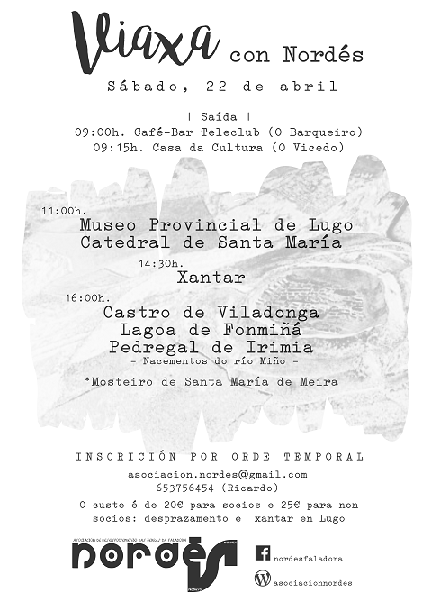 A asociación Nordés Faladora organiza unha viaxe a Lugo o 22 de abril para visitar o Museo Provincial e a Catedral ademais do Castro de Viladonga e Fonmiñá.