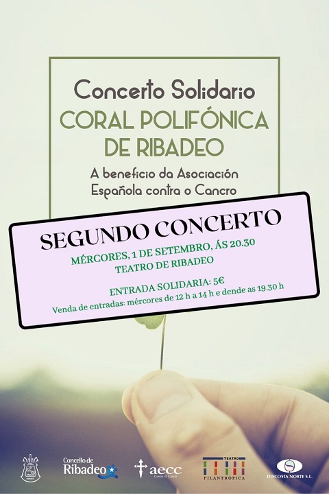 A Coral Polifónica de Ribadeo celebra un novo concerto solidario a beneficio da Asociación Española contra o Cancro. Será este mércores, día 1 de setembro, ás 20:30 horas, no Teatro de Ribadeo.
