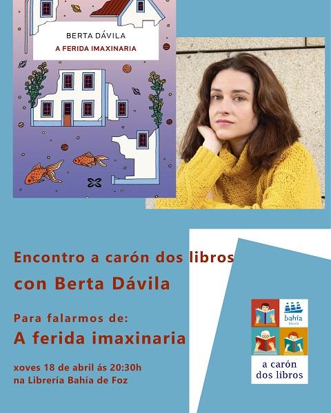 O xoves, 18 de abril, ás 20:30 horas estará na Libraría Bahía a escritora Berta Dávila coa que teremos un coloquio arredor da súa última novela A Ferida Imaxinaria.