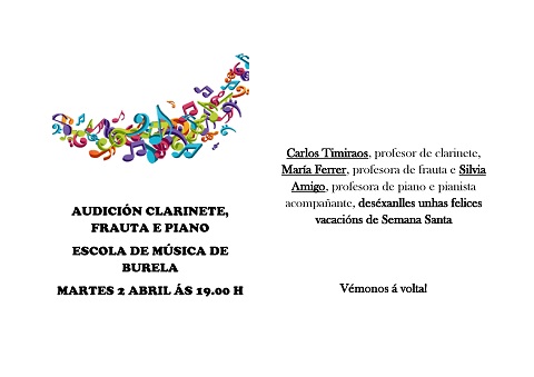 Mañá martes, 2 de abril, ás 19.30 horas, celebrarase na sala de usos múltiples da Escola Municipal de Música de Burela un concerto, con entrada libre e gratuíta, a cargo dos alumnos das especialidades de frauta, clarinete e piano.