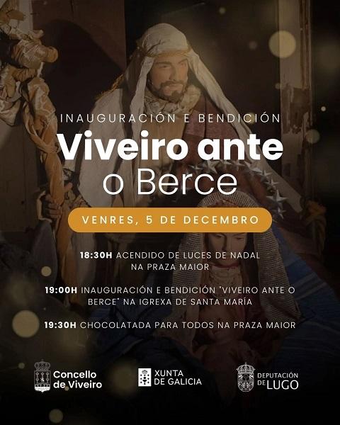O Concello de Viveiro inaugura este venres, día 5 de decembro, o tradicional belén xigante Viveiro ante o Berce. A programación dará comezo ás 18.30 horas co acendido das luces de Nadal na Praza Maior. A continuación, ás 19.00 horas, levarase a cabo a inauguración oficial do belén no adro de Santa María. Para completar a xornada, arredor das 19.30 horas, ofrecerase unha chocolatada na Praza Maior.