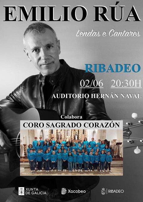 O cantautor Emilio Rúa presentará o seu espectáculo titulado “Lendas e Cantares” en Ribadeo co coro ribadense Sagrado Corazón este domingo, 2 de maio. Será no auditorio municipal Hernán Naval ás 20:30 horas.