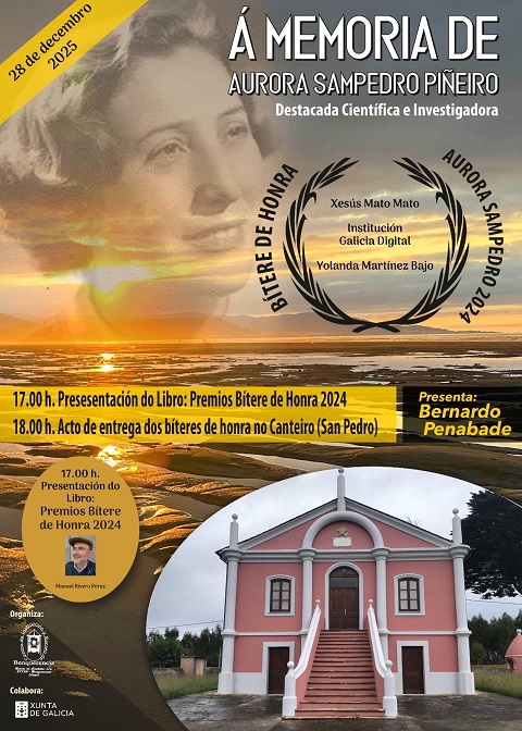 Ás 17 horas terá lugar a presentación do libro Premios Bítere de Honra 2024, do que é autor Manuel Rivero Pérez. E ás 18:00 horas será a entrega dos Bíteres de Honra Aurora Sampedro 2025, que recibirán Xesús Mato (a título póstumo), Galicia Digital (como institución) e Yolanda Martinez Bajo (directora de Talento e Cultura do BBVA).