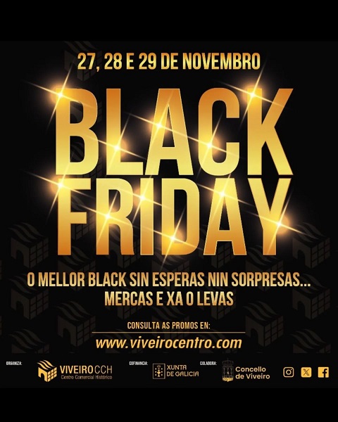 O Centro Comercial Histórico de Viveiro pon en marcha dende este xoves 27 ata o sábado 29 de novembro a campaña co lema O Mellor Black sin esperas nin sorpresas, mercas e xa o levas, unha fin de semana de compras ofrecendo “fantásticos descontos en miles de artigos”.