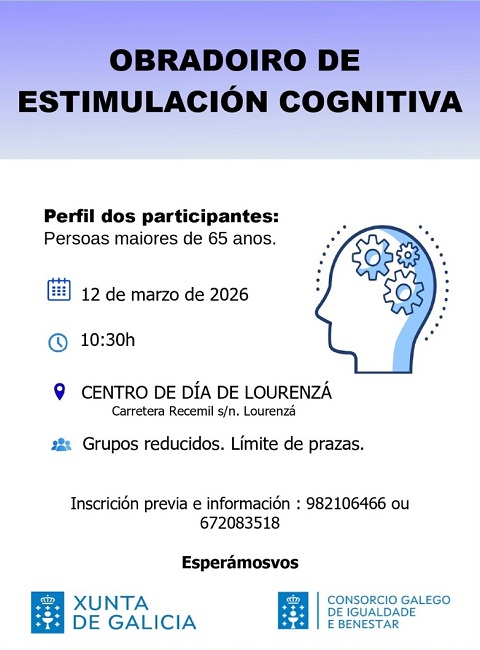 A Xunta de Galicia, a través do Consorcio Galego de Igualdade e Benestar, organiza un obradoiro de estimulación cognitiva dirixido a persoas maiores de 65 anos, co obxectivo de fomentar o benestar e manter activas as capacidades mentais. Celebrarase este xoves, día 12 de marzo, ás 10:30 horas no Centro de Día de Lourenzá (Carretera Recemil s/n).