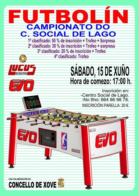 O Centro Social de Lago organiza, por primeira vez, un CAMPIONATO DE FUTBOLÍN, contando coa colaboración do Concello de Xove e a empresa Lucus Recreativos.
