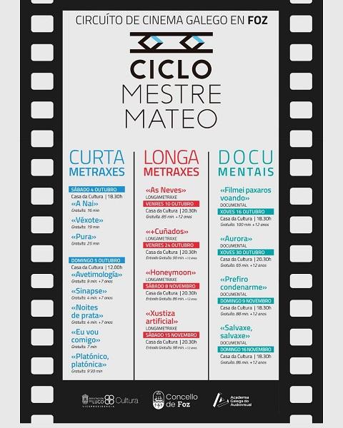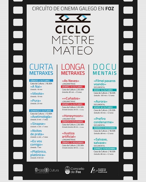 Esta fin de semana, sábado 4 e domingo 5 de outubro, dá comezo o ciclo Mestre Mateo en Foz que achegará ata o día 16 de novembro os títulos finalistas deste certame que premia o mellor audiovisual galego.