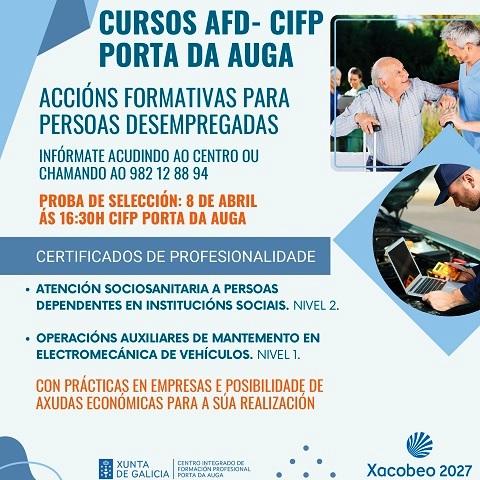 O Centro Integrado de Formación Profesional (CIFP) Porta da Auga, de Ribadeo, ofrece dous cursos gratuítos dirixidos a persoas desempregadas, aínda que tamén poden inscribirse como mellora de emprego persoas que estean a traballar. Estas accións formativas desenvolveranse desde abril ata xullo e inclúen prácticas en empresas, con posibilidade de axudas económicas para a súa realización. Ademais permiten obter o certificado de profesionalidade.