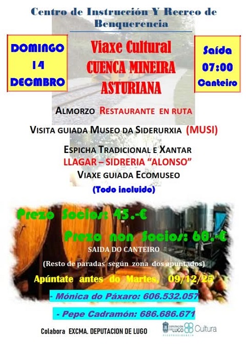 O Centro de Instrucción y Recreo (CIR) de Benquerencia, no municipio de Barreiros, organiza unha viaxe cultural á zona coñecida como Conca Mineira asturiana para este domingo, día 14 de decembro.