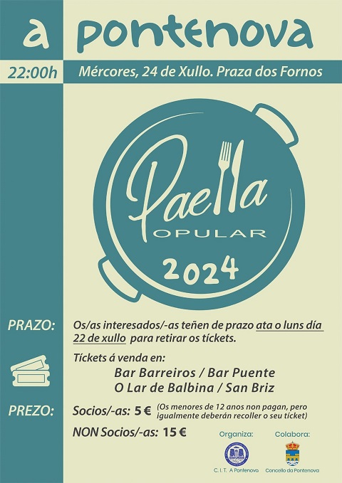O Centro de Iniciativas Turísticas (CIT) da Pontenova organiza unha paella popular para o día 24 de xullo, mércores. Será ás 22:00 horas na Praza dos Fornos.