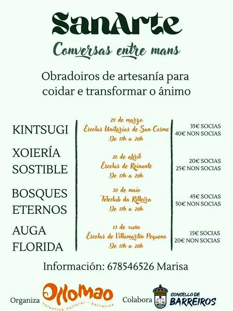 Este domingo, día 29 de marzo na Escolas Unitarias de San Cosme terá lugar o obradoiro Kintsugi, con Maica, de Esquina Atlántica (Mondoñedo); o do 26 de abril será nas Escolas de Reinante e tratará sobre xoiería sostible e paseo pola praia, con Claudia, de Aurarte; o 30 de maio desenvolverase no Teleclub da Rilleira, titúlase Bosques eternos e será impartido por Úrsula, de Kai.Zen Estudio; e o do 13 de xuño será nas Escolas de Vilamartín Pequeno, co título Auga florida e a cargo de Andrea, de Cóxegas na alma. Os catro levaranse a cabo de 17:00 a 20:00 horas.