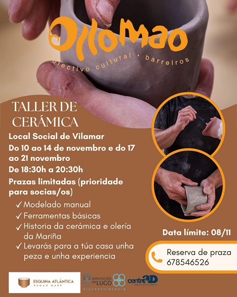 “En Barreiros levamos o barro no nome... e agora tamén nas mans! Dentro do programa Mans Artesás da Deputación de Lugo, Área de Deportes, Artesanía e Deseño e Memoria Histórica/ CENTRAD, chega un curso de cerámica para descubrir o pracer de crear coa terra e a tradición. Da man de Alfar Os Muiños (Mondoñedo), mergullarémonos na arte da alfarería galega, modelando pezas únicas paso a paso, desfrutando mentres aprendemos”, anuncia o colectivo Ollomao.