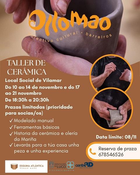 O colectivo cultural Ollomao, de Barreiros, organiza un taller de cerámica que se desenvolverá do 10 ao 14 e do 17 ao 21 de novembro no local do campo da festa de Vilamar de 18:30 a 20:30 horas.