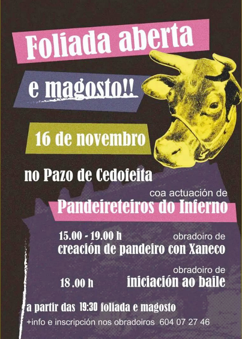 “O sábado 16 de novembro temos preparada unha xornada con obradoiros, actuacións, foliada aberta e castañas. Que non sabes bailar? Apúntate ao obradoiro de iniciación ao baile con Andrea Vilar. Que non tes instrumento? Apúntate ao obradoiro de creación de pandeiro con Xaneco Tubío. E pola noitiña actuación dos Pandeireteiros do Inferno e foliada aberta. Traede os vosos instrumentos e ide entrenando os vosos mellores puntos porque o sábado 16 en Cedofeita toca bailar, tocar, cantar e comer castañas. Haberá tamén bebidas e petiscos”, anuncia o colectivo As Vacas Fracas.