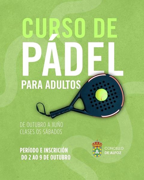 O Concello de Alfoz presenta o II Curso de Pádel para Adultos, que se desenvolverá dende o 18 de outubro ata o mes de xuño. As sesións impartiranse os sábados en horario de tarde, adaptadas aos diferentes niveis de xogo: nivel de iniciación (para persoas que nunca xogaron ou que tiveron un primeiro contacto), sábados de 16:00 a 17:00 horas; nivel intermedio (para quen xa asistiu a cursos previos ou xoga ocasionalmente), sábados de 17:00 a 18:00 e de 18:00 a 19:00 horas; nivel de perfeccionamento (para xogadores/as habituais con experiencia en competición), sábados de 19:00 a 20:00 horas.