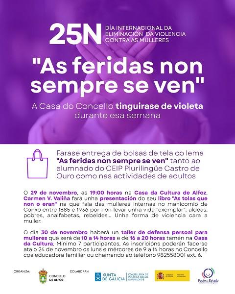 O Concello de Alfoz anuncia que “este lema quere facer visible que as mulleres que foron ou están feridas non sempre se ven, e que moitas das feridas causadas pola violencia non son visibles a simple vista, xa que tamén existen as que deixan marca no plano emocional, psicolóxico ou social. Durante a semana do 25 de novembro, a Casa do Concello tinguirase de violeta como símbolo da loita contra as violencias machistas. Ademais farase entrega de bolsas de tea co lema da campaña tanto ao alumnado do CEIP Plurilingüe Castro de Ouro como nas actividades dirixidas á poboación adulta. Entre as accións programadas destacan: sábado 29 de novembro ás 19:00 horas na Casa da Cultura de Alfoz a escritora Carmen V. Valiña presentará o seu libro As tolas que non o eran, no que fala das mulleres internas no manicomio de Conxo entre 1885 e 1936 por non levar unha vida exemplar: aldeás, pobres, analfabetas, rebeldes... unha forma de violencia cara ás mulleres; e o domingo 30 de novembro, na Casa da Cultura: