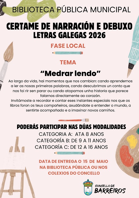 “O 17 de maio celebraremos un día moi importante para as nosas letras e a nosa lingua, que é unha das riquezas máis importantes que posuímos, homenaxeando a Begoña Caamaño, unha muller que coa súa escrita e o seu compromiso feminista deunos unha nova forma de ollar a cultura. Begoña ensinounos que ler é tamén unha forma de entender quen somos e de imaxinar un mundo máis libre e xusto. Baixo o lema Medrar lendo a Biblioteca Municipal de Barreiros abre o certame local para que as nenas e nenos do concello sexan os protagonistas. Queremos que nos contedes, con palabras ou debuxos, eses momentos especiais nos que un libro foi o voso compañeiro de viaxe e vos axudou a imaxinar novos camiños”, anuncia o Concello de Barreiros, que engade: “para participar podedes facelo con narracións propias en galego (máximo un folio) ou debuxos (tamaño A4) nas diferentes categorías: ata 8 anos, de 9 a 11 anos e de 12 a 16 anos. O prazo para presentar os traballos remata o 15 de maio e podedes entregalos na Biblioteca Municipal ou nos colexios de Barreiros”.