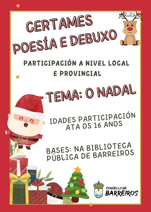 O Concello de Barreiros explica que “os traballos pódense presentar nos colexios de Barreiros ou entregalos na Biblioteca Pública Municipal ata o día 18 de decembro. Cada artista pode presentar tantos traballos como desexe. Aquí os enlaces para ollar as bases ao completo que tamén están a vosa disposición na biblioteca: Debuxo, https://bit.ly/bases_certa_debuxo_nadal_2025; e Poesía, https://bit.ly/bases_certame_poesia_nadal_2025. Moito ánimo e a deixar voar a imaxinación que en nada estamos mergullados no Nadal”.
