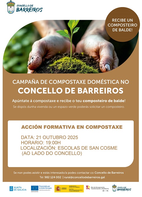 Técnicos especialistas en medio ambiente formarán aos inscritos no programa de compostaxe domiciliaria municipal de Barreiros. O día 21 de outubro, martes, realizarase unha charla nas Escolas de San Cosme (ao lado do Concello) ás 19:00 horas. Nestas xuntanzas tamén se entregarán ás persoas participantes os kits de compostaxe compostos por un composteiro, cun caldeiro doméstico, un aireador, un termómetro, unha criba e unha guía de compostaxe.