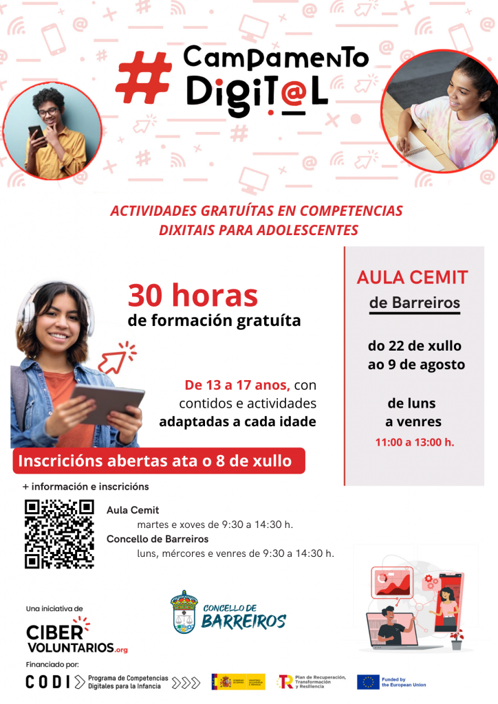 O Concello de Barreiros ofrece un Campamento Dixital, do 22 de xullo ao 9 de agosto na aula CeMIT, para a mocidade de 13 a 17 anos. É gratuíto de 30 horas en competencias dixitais, con contidos adaptados a cada idade e formadores especializados. Levarase a cabo en horario de 11:00 a 13:00 horas. As persoas interesadas en participar poderán inscribirse na propia aula CeMIT os martes e xoves de 9:30 a 14:30 horas ou os resto de días na Casa do Concello no mesmo horario ata o 8 de xullo.