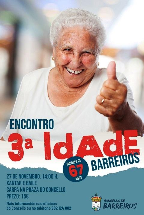 O Concello de Barreiros organiza o día 27 de novembro, xoves, un encontro da terceira idade para maiores de 67 anos. Haberá xantar e baile nunha carpa que se instalará na Praza do Concello.