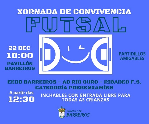 O Concello de Barreiros anuncia que “os partidos darán comezo ás 10:00 horas e a partir das 12:30 horas haberá inchables con entrada libre para todas as crianzas que se queiran achegar”.