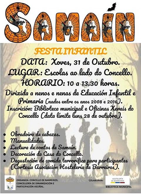 A festa desenvolverase entre as 10:00 e as 13:30 horas e celebraranse obradoiros de cabazas, manualidades, lectura de contos de Samaín, decoración da Casa do Concello e degustación de comida terrorífica para os participantes, cortesía da Asociación de Hostelería de Barreiros.
