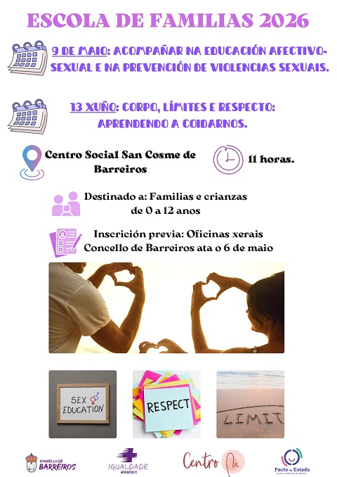 A Concellería de Igualdade do Concello de Barreiros presenta unha nova edición da Escola de Familias para o ano 2026, “un programa formativo que busca ofrecer ferramentas ás familias para abordar a educación afectivo-sexual e a prevención de violencias desde as idades máis temperás. Esta iniciativa marca un fito na xestión municipal, ao ser o primeiro goberno da historia de Barreiros en organizar espazos educativos para as familias, chegando este ano 2026 á súa quinta edición e afianzándose coma unha das múltiples actividades que se integran no programa +Igualdade Barreiros”. Haberá actividades os días 9 de maio e 13 de xuño.