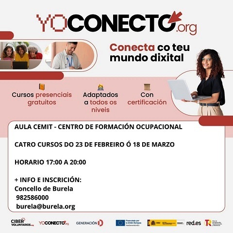 O Concello de Burela, a través das áreas de Servizos Sociais e Inmigración, pon en marcha unha nova edición de cursos gratuítos de formación dixital Yo conecto, dirixidos á veciñanza. A iniciativa desenvolverase na Aula CeMIT do Centro de Formación Ocupacional e inclúe catro accións formativas diferentes que se impartirán entre o 23 de febreiro e o 18 de marzo.
