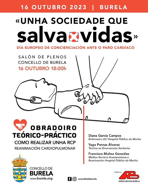 O obradoiro será ás 18:00 horas no salón de plenos do Concello de Burela e os ponentes Diana García Campos, enfermera da UCI do Hospital Público da Mariña; Yago Pernas Alvarez, técnico en emerxencias sanitarias, e Francisco Muñoz González, médico do Servizo de Anestesioloxía e Reanimación do Hospital Público da Mariña.