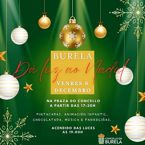 O Concello de Burela anuncia que acenderá as súas luces de Nadal o venres 6 de decembro na Praza do Concello “cunha gran celebración. A partir das 17:30 horas haberá pintacaras, animación infantil, chocolatada, música e panxoliñas”.