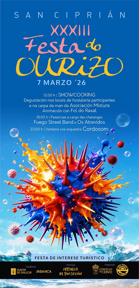 O Concello de Cervo anuncia que “para ese día están programadas diferentes actividades nas que o equinoderno será o eixo central, como homenaxe á tradición gastronómica local e á estreita relación da vila co mar. A cita foi presentada pola alcaldesa, Dolores García Caramés; o concelleiro Adrián Arias, a edil Mali Méndez, e por representantes da hostalería local e da asociación Mistura, que participan neste evento declarado de Interese Turístico Galego. O programa arrincará ás doce do mediodía cun showcooking que poderá ser seguido en directo polo público asistente, que a continuación degustará as tapas elaboradas polos chefs participantes. Ademais a asociación Mistura tamén ofrecerá desde o mediodía unha degustación de ourizo cocido na mesma carpa instalada na Praza dos Campos. O día da festa os locais participantes -O Noso Lar, As Titas, Bodega de Ana, O Faro, bar El Puerto, Cervecería A Penúltima, Maruxaina e Bar Habana- ofrecerán diferentes variedades aos visitantes durante toda a xornada. O día estará amenizado a mediodía por Fol de Raxal, e xa pola tarde haberá pasarrúas da man das Charangas Fuego Street Band e Os Atrevidos. Xa pola noite, desde as 23:00 horas amenizará a velada a orquestra Cordosom na Praza dos Campos”.