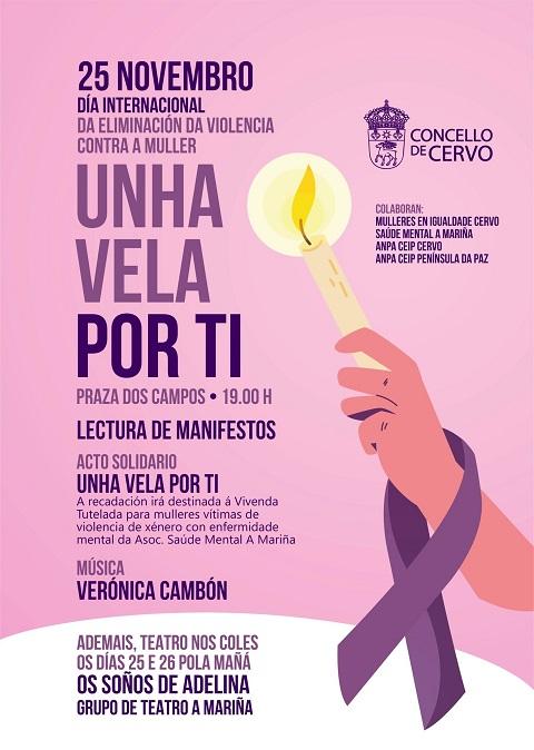 O martes 25 de novembro ás 19:00 horas na Praza dos Campos, terá lugar o acto central Unha vela por ti, que incluirá a lectura de manifestos, ademais dun acto solidario cuxa recadación se destinará á vivenda tutelada para mulleres vítimas de violencia de xénero con enfermidade mental da Asociación Saúde Mental A Mariña. A xornada completase coa actuación musical de Verónica Cambón.