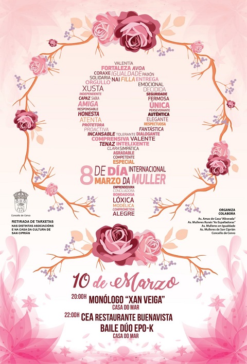 Organizan e colaboran a asociación de amas de casa Alborada, a asociación de mulleres rurais As Espalladoras, a asociación Mulleres en Igualdade, a asociación Mulleres de San Ciprián e o Concello de Cervo.