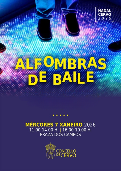 O Concello de Cervo anuncia que a actividade prevista para pechar a programación deste Nadal terá lugar na Praza dos Campos, de San Ciprián, este mércores, 7 de xaneiro: “alfombras de baile, para pasar un anaco ben divertido!”.