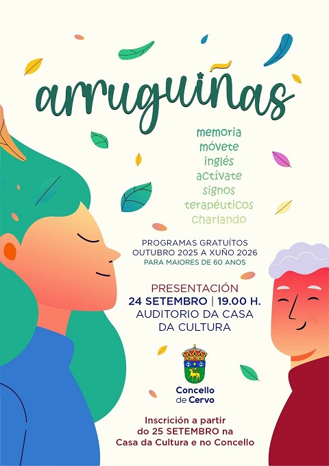 O Concello de Cervo pon en marcha unha nova edición do programa Arruguiñas, dirixido ás persoas maiores de 60 anos. Comezará no mes de outubro e prolongarase ata xuño de 2026. O prazo de inscrición estará aberto a partir deste xoves, día 25 de setembro, na Casa da Cultura e no Concello.