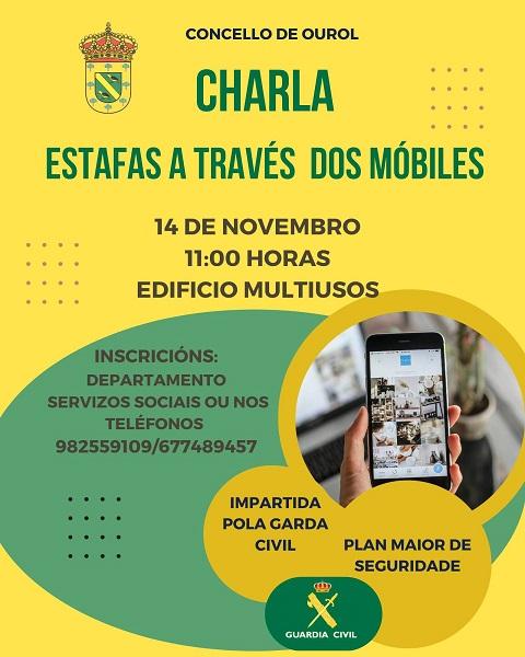 O Concello de Ourol, en colaboración coa Garda Civil, vai a levar a cabo unha charla sobre as estafas a través dos teléfonos móbiles e outros problemas de seguridade nas persoas maiores. Esta charla está enmarcada dentro do Plan Maior de Seguridade posto en marcha polo Ministerio de Interior dirixido á prevención e mellora da seguridade das persoas maiores. Terá lugar no Edificio Multiusos do Concello o xoves 14 de novembro ás 11:00 horas.