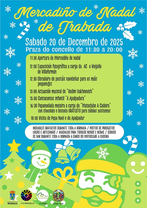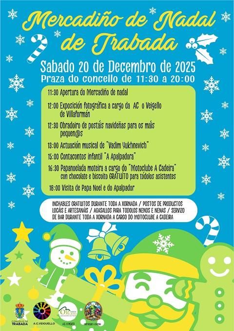 O Concello de Trabada organiza -xunto coas entidades locais A.C. Veiguello, A.C. O Picato e o Motoclube A Cadeira- para o sábado, 20 de decembro, unha nova edición do Mercadiño de Nadal, que terá lugar na Praza do Concello entre as 11:30 e as 20:00 horas. A xornada inclúe actividades para todas as idades, música en directo, obradoiros, mostra de produtos locais e artesáns, así como propostas especialmente dirixidas ao público infantil.
