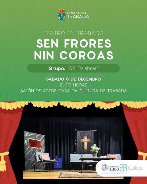 O Concello de Trabada “consolida a súa aposta pola cultura e polo teatro afeccionado coa continuación dos ciclos teatrais que, como cada primeiro sábado de mes, ofrecen á veciñanza unha proposta escénica de calidade e aberta a todos os públicos”. Este sábado, día 6 de decembro, ás 21:00 horas, o salón de actos da Casa da Cultura acollerá a representación da obra Sen frores nin coroas, a cargo do grupo 57 Palabras, “unha compañía que chega a Trabada cunha peza cargada de humor, retranca e emoción”.