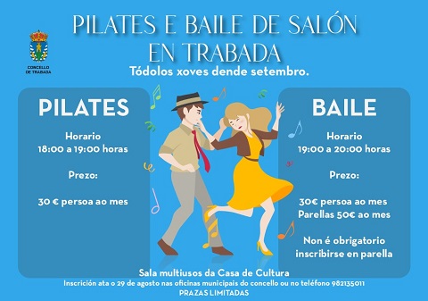 O Concello de Trabada anuncia que está aberto o prazo de inscrición para participar nas actividades de pilates e baile de salón, que se impartirán todos os xoves a partir de setembro na sala multiusos da Casa da Cultura.