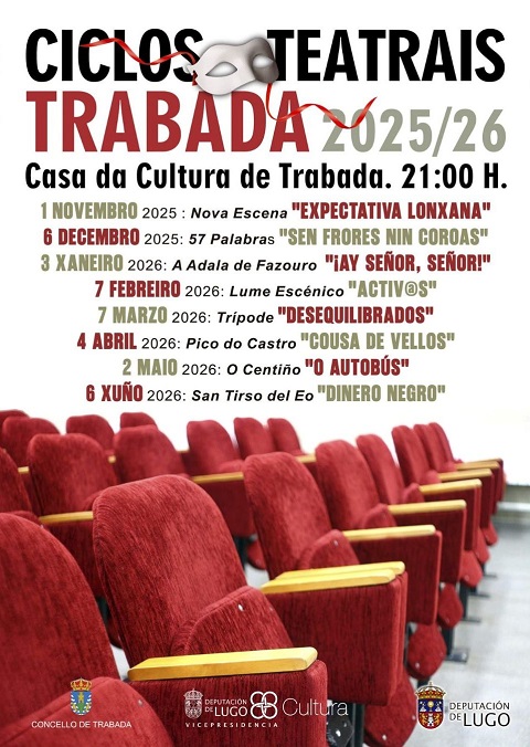 O Concello de Trabada, en colaboración coa Deputación de Lugo, pon en marcha unha nova edición dos Ciclos Teatrais, unha programación cultural que se celebrará na Casa da Cultura de Trabada o primeiro sábado de cada mes, dende novembro ata xuño. O ciclo dará comezo o 1 de novembro coa obra Expectativa Lonxana, do grupo Nova Escena, e continuará con diferentes compañías teatrais da comarca e da provincia, como 57 Palabras, A Adala de Fazouro, Lume Escénico, Trípode, Pico do Castro, O Centiño e San Tirso del Eo. As representacións, de xénero principalmente cómico, serán ás 21:00 horas.