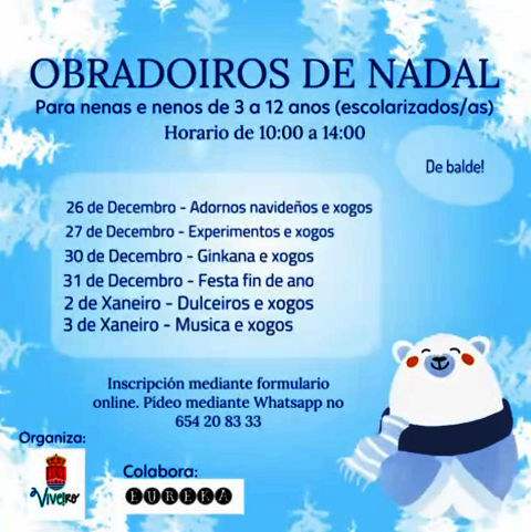O Concello de Viveiro anuncia unha nova edición dos obradoiros de Nadal, dirixidos a nenas e nenos de 3 a 12 anos que estuden nalgún dos centros educativos do municipio. Terán lugar os días 26, 27, 30 e 31 de decembro e mais os días 2 e 3 de xaneiro. Haberá xogos, experimentos, música e máis actividades. É de balde e a inscrición será mediante formulario online no enderezo https://docs.google.com/.../1FAIpQLSeMf1_Uw.../viewform