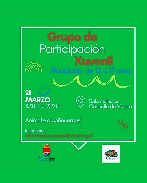 “Se queres facer novas amizades, compartir ideas e participar activamente no que pasa en Viveiro, este é o teu sitio. O Concello de Viveiro invita a toda a mocidade a sumarse ao noso Grupo de Participación Xuvenil. Un espazo pensado por e para vós, onde a vosa voz conta”, anuncia o Concello de Viveiro.