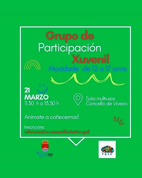 O Concello de Viveiro presenta un grupo de participación xuvenil, para mocidade de 12 a 17 anos de idade. Será este sábado, día 21 de marzo, de 11:30 a 13:30 horas na Sala Multiusos municipal.