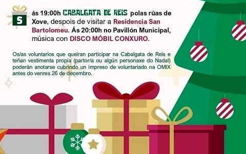 O Concello de Xove, a través do Departamento de Cultura, fai un chamamento á veciñanza para colaborar no tradicional Desfile dos Reis Magos, que percorrerá as rúas do municipio o día 5 de xaneiro a partir das sete da tarde “co obxectivo principal de manter viva a maxia do Nadal no día máis especial tanto para os máis pequenos como para os maiores. Desde o departamento solicitamos a participación de persoas voluntarias que dispoñan de vestimenta ou atavíos propios destas datas, tales como pastores ou pastoras, paxes reais, elfos, personaxes de Disney ou outros personaxes infantís, para participar nas carrozas preparadas para acompañar aos Reis Magos no seu desfile polas rúas de Xove”.